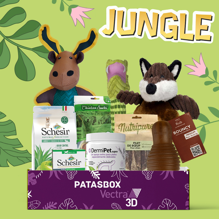 La Patasbox Jungle viene cargadita de sorpresas para una experiencia salvaje que no dejará indiferente a tu perro. Juguetes, snacks naturales y comida deliciosa.
